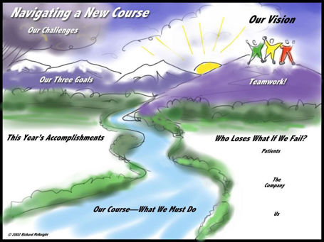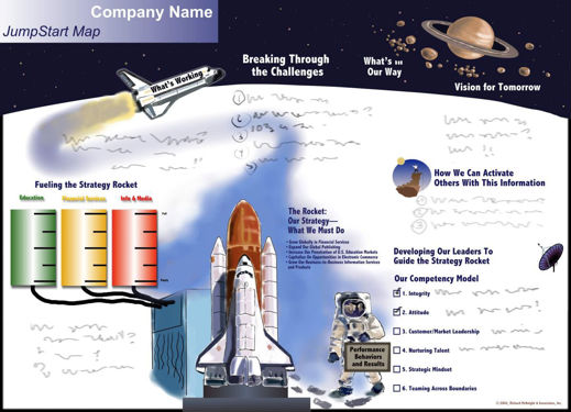 We developed this map with the senior team of an international publishing company. The team was intrigued with space flight as a metaphor for their strategy.